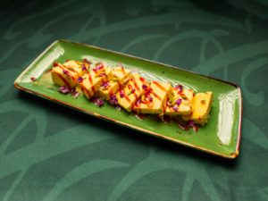 jleisch und gebratenen Auberginen in einer knackigen Reiskruste geschmückt mit