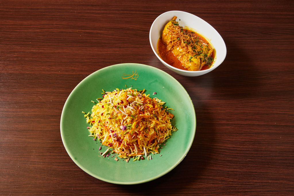 Safran Reiskuchen mit einer inneren zarten Safran-Joghurt-Marinade, eingelegtem