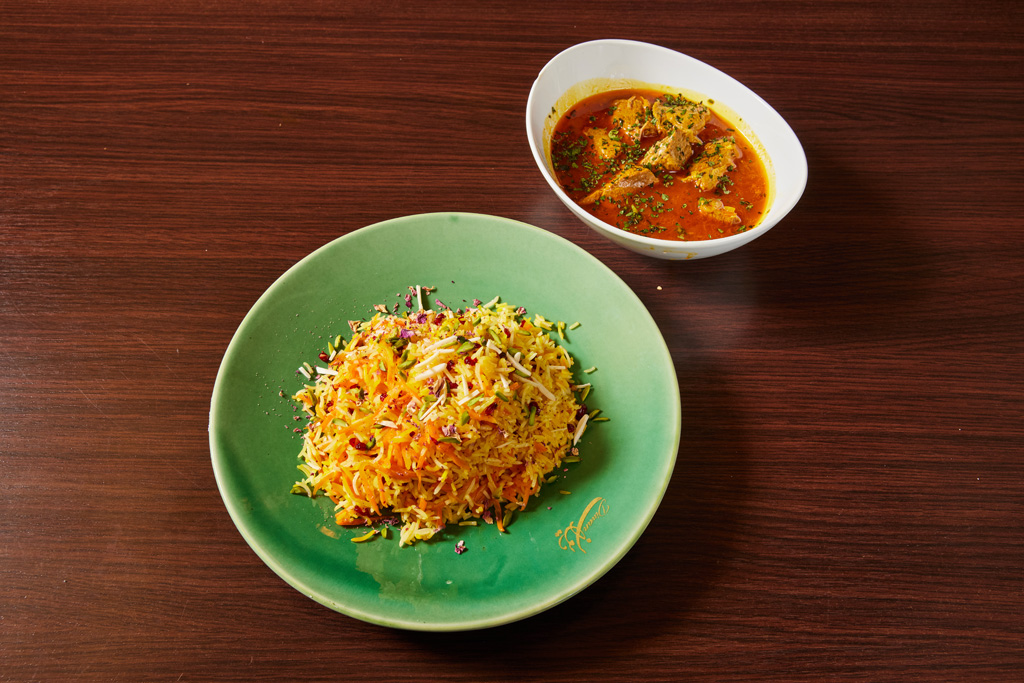 Westiranische Spezialität (Azerbaidschanisch) Persischer Basmatireis mit dünn geschnittenen Karotten verfeinert mit Limetten-Saurem Traubensaft und Safran, geschmorten Pflaumen und Hähnchen in einer pikant-würzigen Süß-Sauersauce, Pistazien, Berberitzen, Mandeln