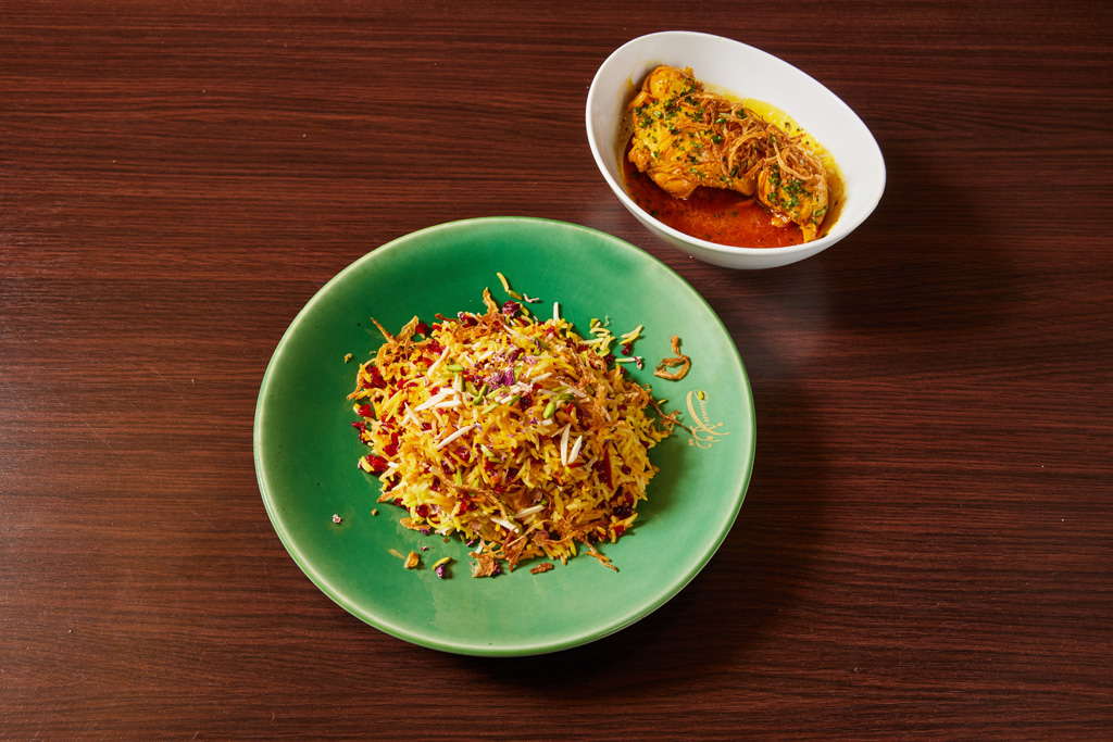 Zart geschmorte Hühnerschenkel, karamellisierten Zwiebeln serviert mit persischem Juwelenreis (Pistazienstiften, Mandelstiften und Berberitzen)