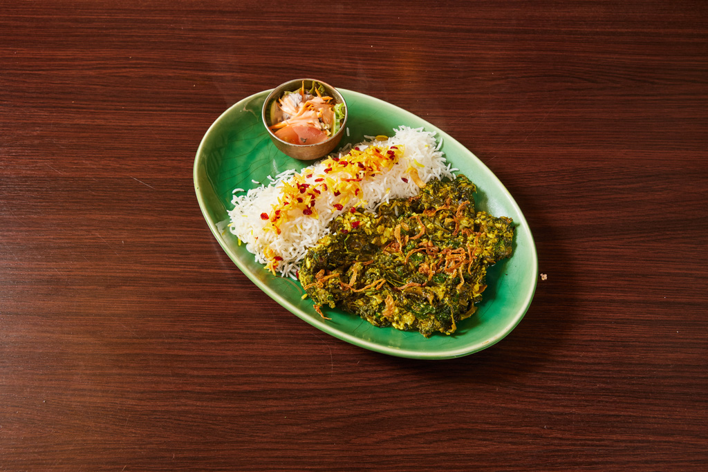 Schmorgericht mit verschiedenen fein gehackten frischen persischen Kräutern (Spinat, Petersilie, Koriander, Schnittlauch und Bockshornklee), zart gegartem Kalbfleisch, Kidneybohnen und getrockneten Limetten serviert mit Basmatireis