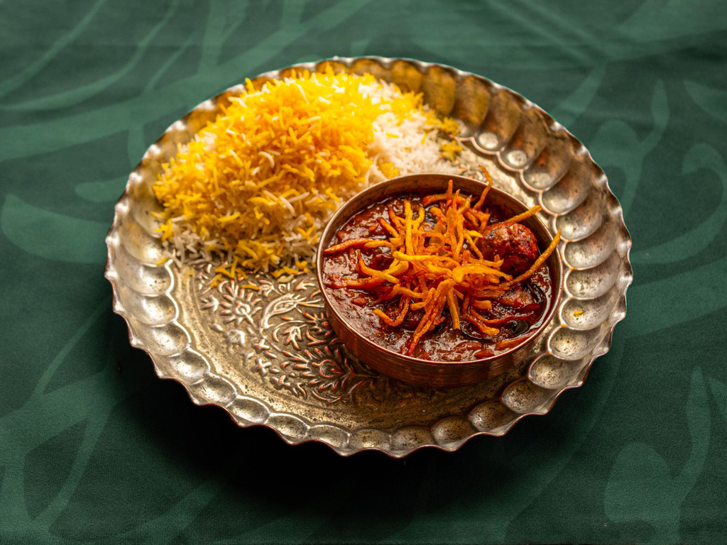 Westiranische Spezialität (Azerbaidschanisch) Persischer Basmatireis mit dünn geschnittenen Karotten verfeinert mit Limetten-Saurem Traubensaft und Safran, geschmorten Pflaumen Pilzen in einer pikant-würzigen Süß-Sauer-Sauce