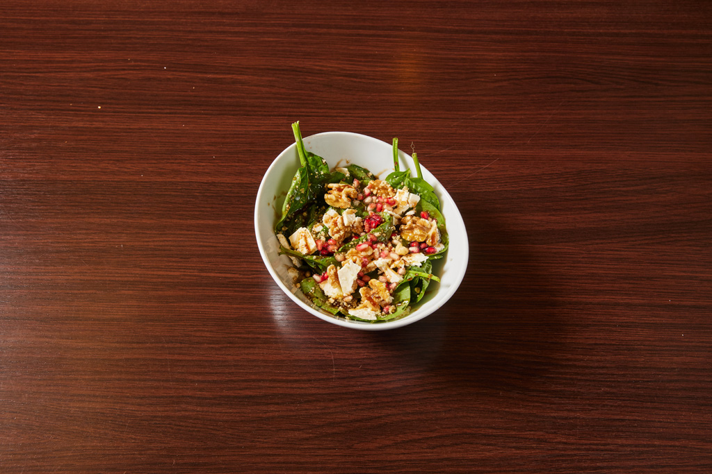 Babyspinatblätter Granatapfelkernen, Schafskäse und geriebenen Walnüssen