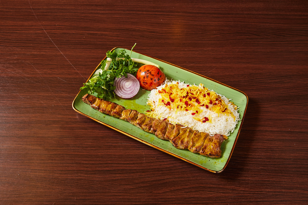 Je 1 Spieß Barg & Kubideh serviert mit Basmatireis und gegrillter Tomate